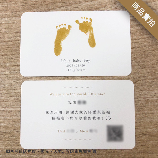 想要有一張寶寶的彌月卡,又怕加上相片後會被丟棄嗎?我們改用寶寶出生的足印,經過加工轉印在卡片上,即有寶寶的獨特印記,又不用擔心萬一被丟棄後在垃圾桶裡看見照片。可說是一舉二得,又不失質感,絕對可以為寶寶的滿月禮加分不少喲!